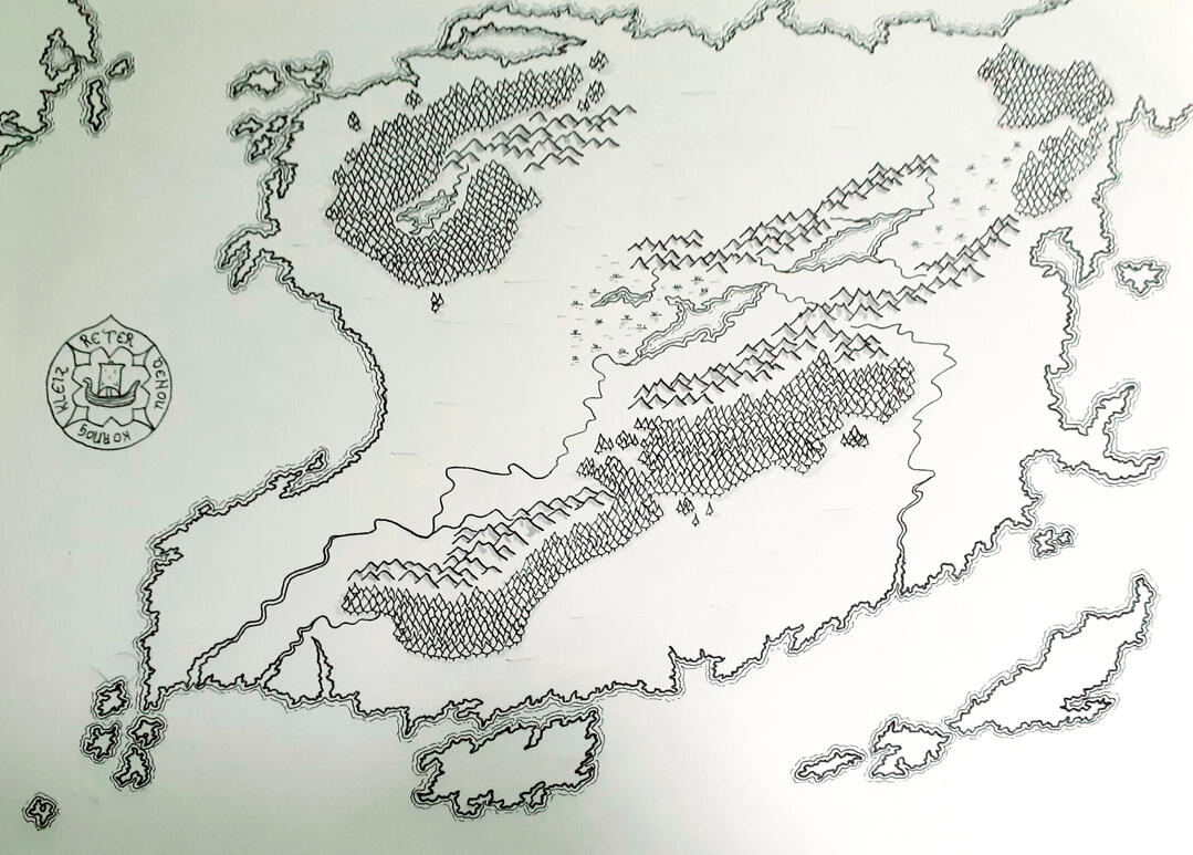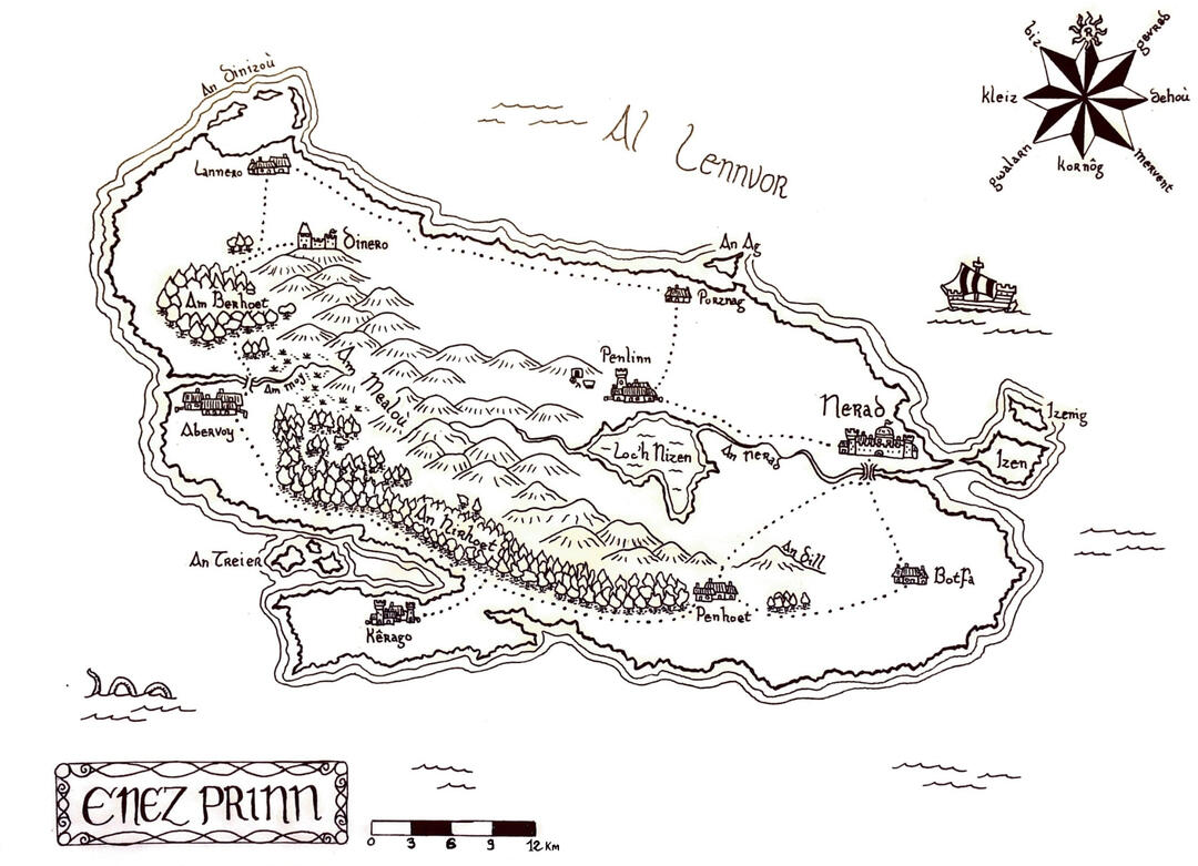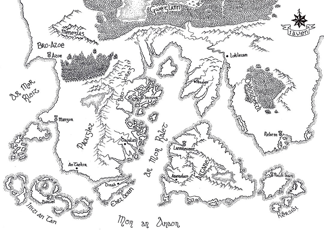 No "Iàbhain" sa Ghàidhlig. 'S e saoghal làn draoidheachd agus cluaineas poilitigeach a th' ann. Tha e air a roinn eadar na dùthchannan a leanas: Rìoghachd Dehouberzh (Pàirt a Deas), Rìoghachd Artanez, Tighearnas Kêrsidi (Cathair Sìoda), Co-chaidreachas nam Moragais ("Bro-Voreg"), Tighearnas Enez Doun (Innis Domhain), Tighearnas Paouglez (Pòbhglais), Rìoghachd Azoe (Asoa), Tighearnas Inizi an Tan (Innseachan an Teine), Rìoghachd Sìtheanaich Meneglas (Am Monadh Glas), agus Gweglann (Dùthaich nam Famhairean).