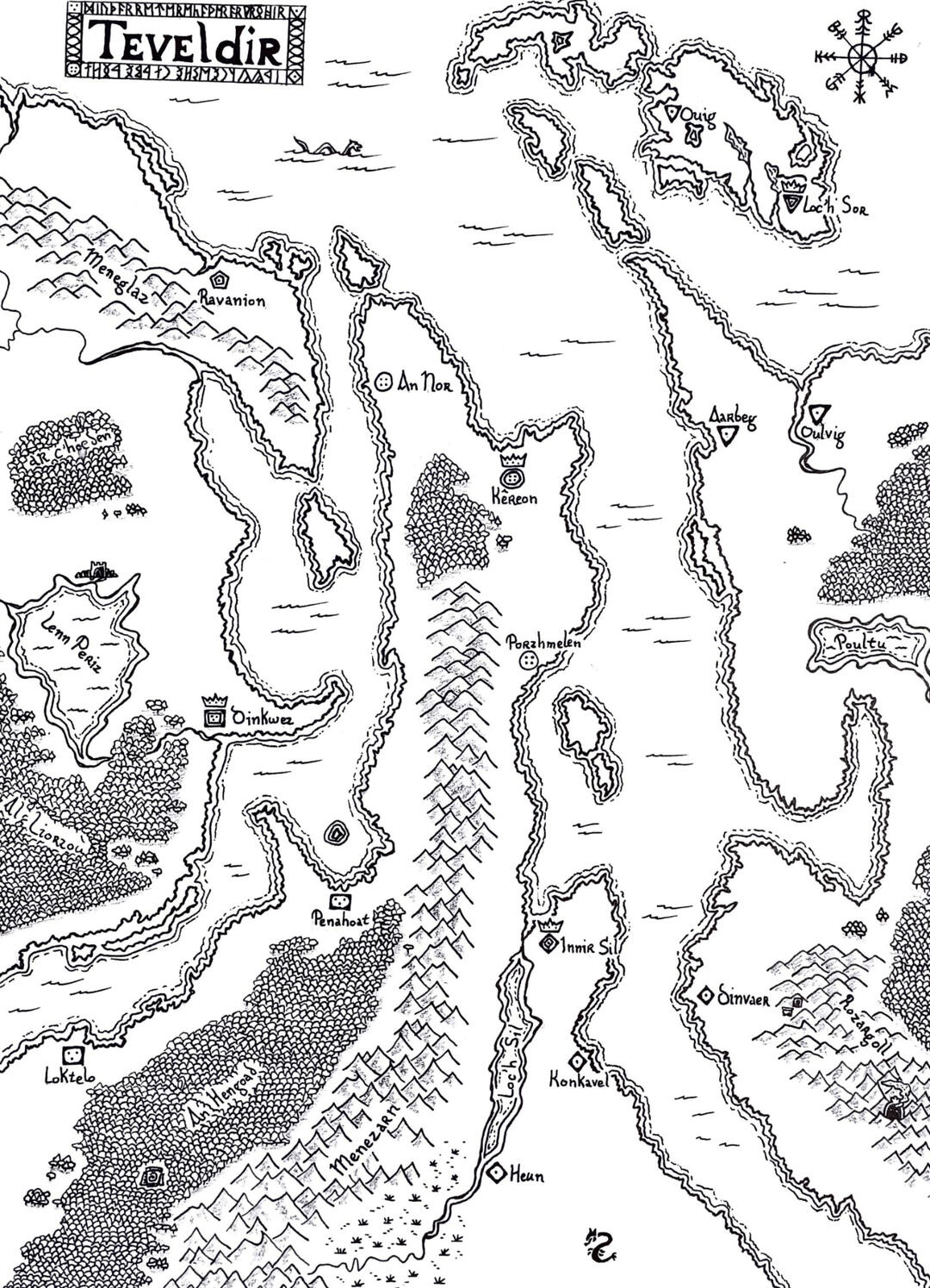 No Teimheal, sa Ghàidhlig. Tha Teimheal làn dìomhairean agus gu math cunnartach air sàillibh nam mairbh-draoidh agus buidsichean a tha ri lorg ann. Gheobhar còig dùthchannan mòra ann: Tìrfhada (prìomh-bhailtean: Kêreon no Cathair Eòin; An Nor; Porzhmelen no Port Mhealain); Rìoghachd nan Eilean (prìomh-bhailtean: Loch Sòr; Aarbeg no Àrdbeag; Oulvig no Ùilbhig; Ouig no Uig); Rìoghachd Chaolfhada (prìomh-bhailtean: Innir Sil no Inbhir Sìl; Konkavel no Cong Abhail; Heun; Dinvaer no Dùn Mhaithir); Kelevig (prìomh-bhailtean: Dinkwez no Dùn na Coille; Loktelo no Log Tealo; Penahoat no Ceann na Coille); agus Tighearnas Ravanion (cathair-stàit Ravanion). A thuillidh air na dùthchannan sin, gheobhar rìoghachdan Sìtheaichean agus Famhairean, sa mhòr-chuid sna coilltean agus faisg air oir a' mhapa.
